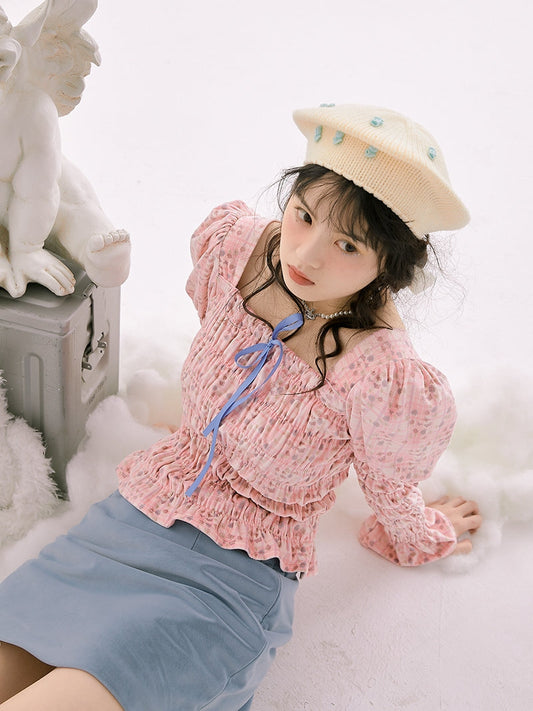 Wrinkled Gather Peplum Power-shoulder Blouse